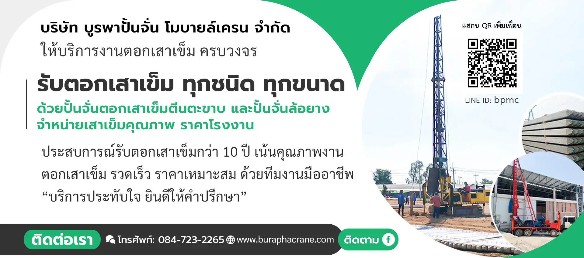 บริษัท บูรพาปั้นจั่น โมบายล์เครน จำกัด ได้จดทะเบียนบริษัทดำเนินธุรกิจตอกเสาเข็มถูกต้องตามกฎหมาย เราคือผู้ให้บริการตอกเสาเข็มด้วยปั้นจั่นตีนตะขาบทั้งภาครัฐและเอกชน ที่เน้นคุณภาพทันเวลา ราคาถูกที่สุด ใช้เวลาติดตั้งไม้เกิน 30 นาที ก็สามารถทำงานได้ ด้วยประสบการณ์การทำงาน ด้าน ตอกเสาเข็มด้วยปั้นจั่นตีนตะขาบ ปั้นจั่นล้อยาง มากกว่า 10 ปี ทำให้เราคือผู้เชี่ยวชาญด้านการตอกเสาเข็ม ทุกชนิด ทุกขนาด ไม่ว่าจะเป็นเสาเข็มบ้าน เสาเข็มรั้ว เสาเข็มโรงงาน เสาเข็มบ้านจัดสรร เสาเข็มตึก เสาเข็มหอพัก และเสาเข็มอื่น ๆ อีกมากมายตามต้องการ คุณจึงมั่นใจได้เลยว่างานจะออกมาอย่างน่าพอใจคุ้มกับราคาที่จ้างอย่างแน่นอน